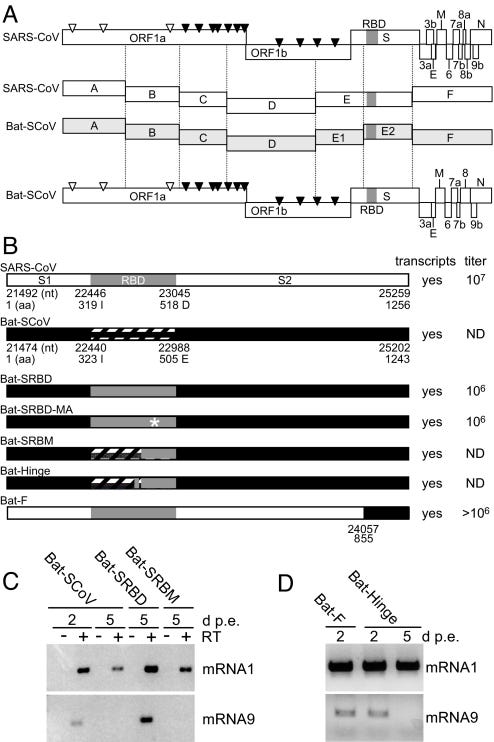 Schematic representation of SARS-CoV and Bat-SCoV variants. (A) Schematic representation of SARS-CoV and Bat-SCoV (GenBank accession no. FJ211859) genomes and reverse genetics system. (Top) Arrowheads indicate nsp processing sites within the ORF1ab polyprotein (open arrowheads, papain-like proteinase mediated; filled arrowheads, nsp5 [3C-like proteinase] mediated). Immediately below are the fragments used in the reverse genetics system, labeled A through F. The fragments synthesized to generate Bat-SCoV exactly recapitulate the fragment junctions of SARS-CoV with the exception that the Bat-SCoV has 2 fragments, Bat-E1 and Bat-E2, which correspond to the SARS-E fragment. (B) Schematic representation showing organization of the SARS-CoV and Bat-SCoV Spike proteins. The engineered Spike proteins are pictured below with the virus name to the left. Bat-SRBD includes all of the Bat-SCoV Spike sequence except that the Bat-SCoV RBD (Bat-SCoV amino acid 323–505) is replaced with the SARS-CoV RBD (amino acid 319–518) (GenBank accession no. FJ211860). Bat-SRBD-MA includes the MA15 Spike RBD change at SARS-CoV aa Y436H. Bat-SRBM includes the minimal 13 SARS-CoV residues critical for ACE2 contact, resulting in a chimeric RBD of Bat-SCoV amino acid 323I-429T and SARS-CoV amino acid 426R-518D. Bat-Hinge is Bat-SRBM sequence, with Bat-SCoV amino acid 392L-397E replaced with SARS-CoV amino acid 388V-393D. Bat-F includes nt 1–24057 of SARS-CoV (to Spike amino acid 855), with the remaining 3′ sequence from Bat-SCoV. To the right of the schematic representations, observation of transcript activity and approximate stock titers at passage 1 (P1) are indicated. ND indicates no infectious virus detected by plaque assay. (C and D) Presence of genomic and subgenomic transcripts after electroporation of in vitro transcribed viral RNA. Band corresponding to mRNA1 indicates the presence of genomic RNA, either electroporated genomic RNA or progeny genomic RNA, and the presence of a band corresponding to mRNA9 indicates the presence of leader-containing subgenomic RNA, consistent with mRNA transcription.