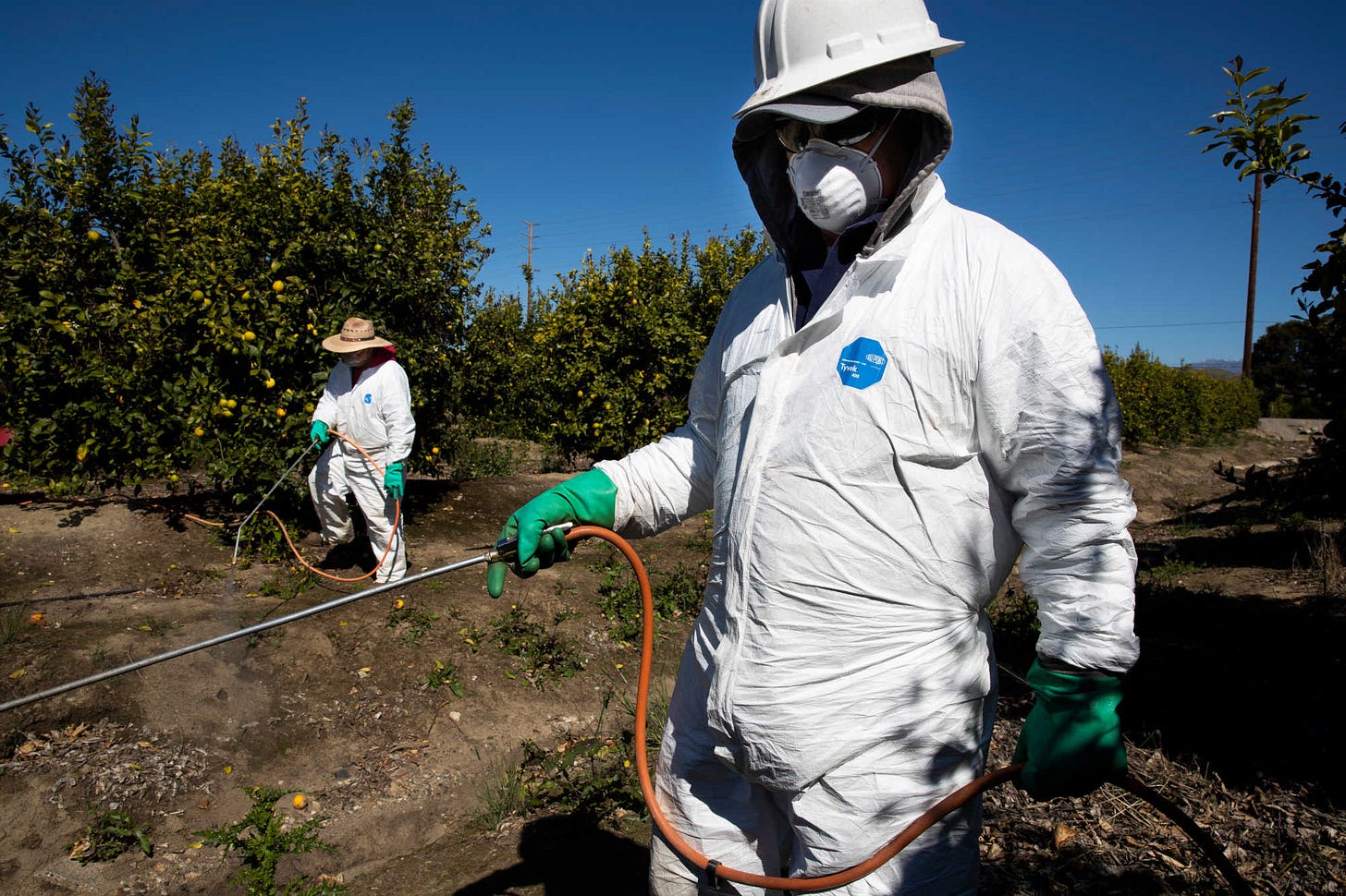Agricultural laborers spray pesticides and insecticides in the orchards of a fruit farm in Mesa, California. Pesticides have been a target of the MAHA movement, and some scientists have been concerned about their effects for decades. Visual: Brent Stirton/Getty Images