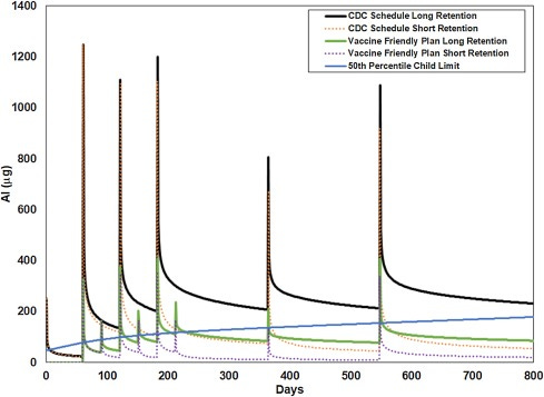 Figure from our study published in 2020 comparing various vaccine schedules Note the clearance rate is insufficient in the CDC schedule to allow infants to ever go below the per-body-weight toxic level. The Excel file that performs these calculations was published by the journal so anyone can estimate clearance and accumulation dynamics from any proposed schedule.