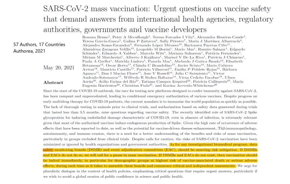 One issue that bothers many ethical medical physicians, including Dr. Peter McCullough, is that there has been insufficient independent oversight of the vaccine safety studies. Early on there was no External Advisory Committee, and the VRBAC committee’s input was not sought on the FDA’s approval of Pfizer’s COVID-19 vaccine. There has been no independent data safety monitoring board (DSMB), and no involvement of a Human Ethics Committee.