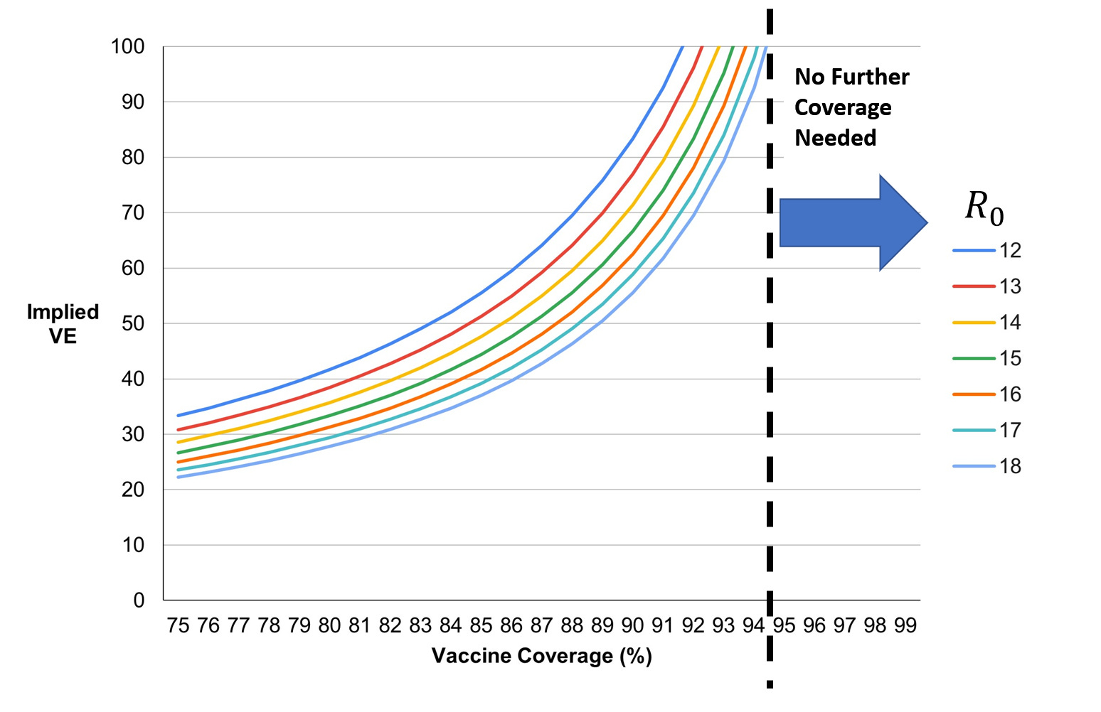 Assuming “required coverage for herd immunity” from 75% all the way to 100%, we can use Equation 1 to solve for the implied vaccine efficacy (VE).