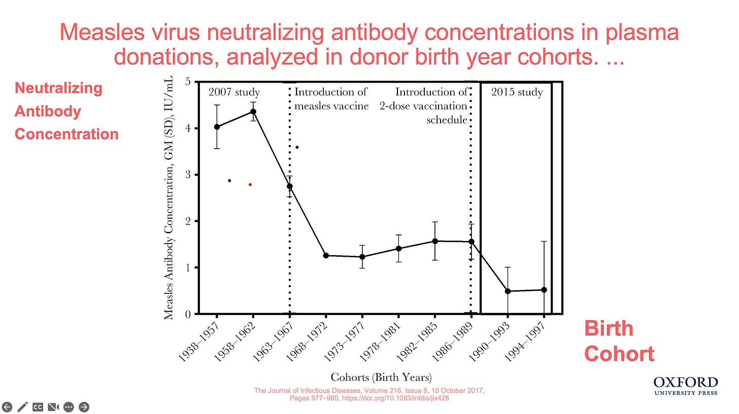 “The matter that concerns me greatly is shown in the attached graph. Measles neutralizing antibody titers in healthy blood donor cohorts before measles vaccination (natural infection) and after one and two-dose policies. Neutralizing antibody titers are the Public Health and industry standard of vaccine immunity. This graph really highlights the virgin soil population concern that has been created by vaccination. It also underscores the failure of revaccination to address this issue.”