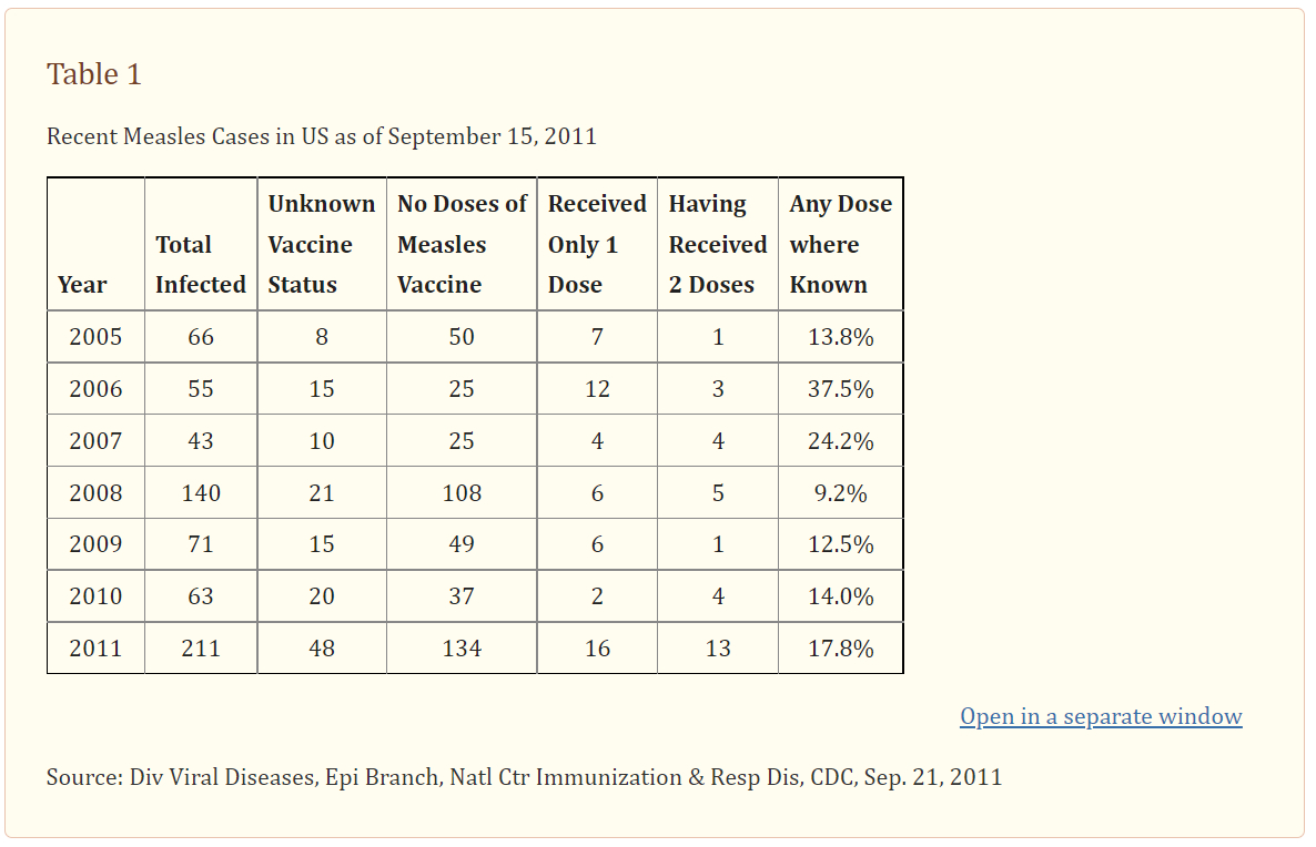 Their paper, of course, was not the only warning sign. Gregory Poland, an ardent pro-vaccine researcher, published this table showing that prior years’ data showed an unacceptably high rate of “breakthrough” cases of measles.