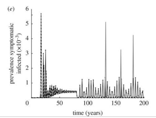 Abstract: For infectious diseases where immunization can offer lifelong protection, a variety of simple models can be used to explain the utility of vaccination as a control method. However, for many diseases, immunity wanes over time and is subsequently enhanced (boosted) by asymptomatic encounters with the infection. The study of this type of epidemiological process requires a model formulation that can capture both the within-host dynamics of the pathogen and immune system as well as the associated population-level transmission dynamics. Here, we parametrize such a model for measles and show how vaccination can have a range of unexpected consequences as it reduces the natural boosting of immunity as well as reducing the number of naive susceptibles. In particular, we show that moderate waning times (40–80 years) and high levels of vaccination (greater than 70%) can induce large-scale oscillations with substantial numbers of symptomatic cases being generated at the peak. In addition, we predict that, after a long disease-free period, the introduction of infection will lead to far larger epidemics than that predicted by standard models. These results have clear implications for the long-term success of any vaccination campaign and highlight the need for a sound understanding of the immunological mechanisms of immunity and vaccination.