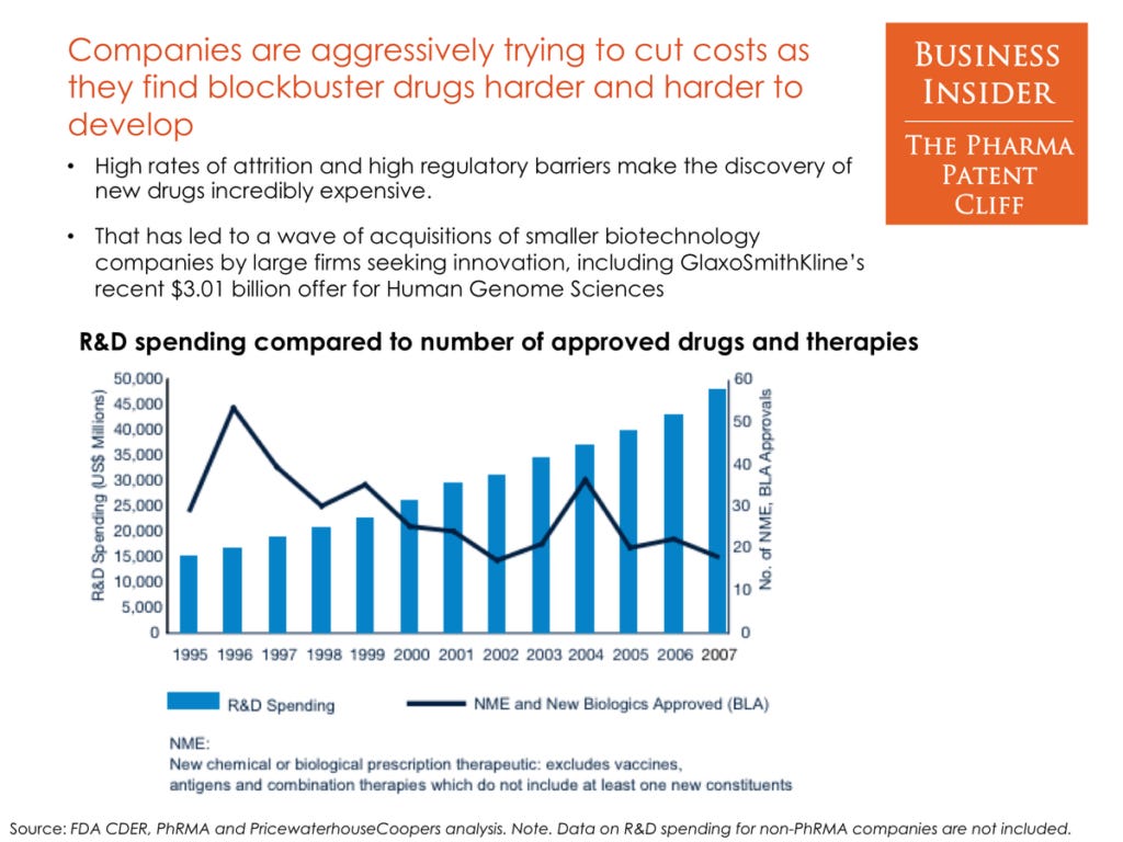 Big Pharma must soon confront an industry-wide hazard that reaches magnitudes far greater than the typical concerns of corporate profit margins and business politics. Through years of industry consolidation, it has essentially made itself “too big to fail.” Only now, the model which it once could never fail within — that is, the practice of obtaining patent exclusivity over drugs that are approved through clinical trials and regulations — has become obsolete, even impossible, under the current conditions of the industry.