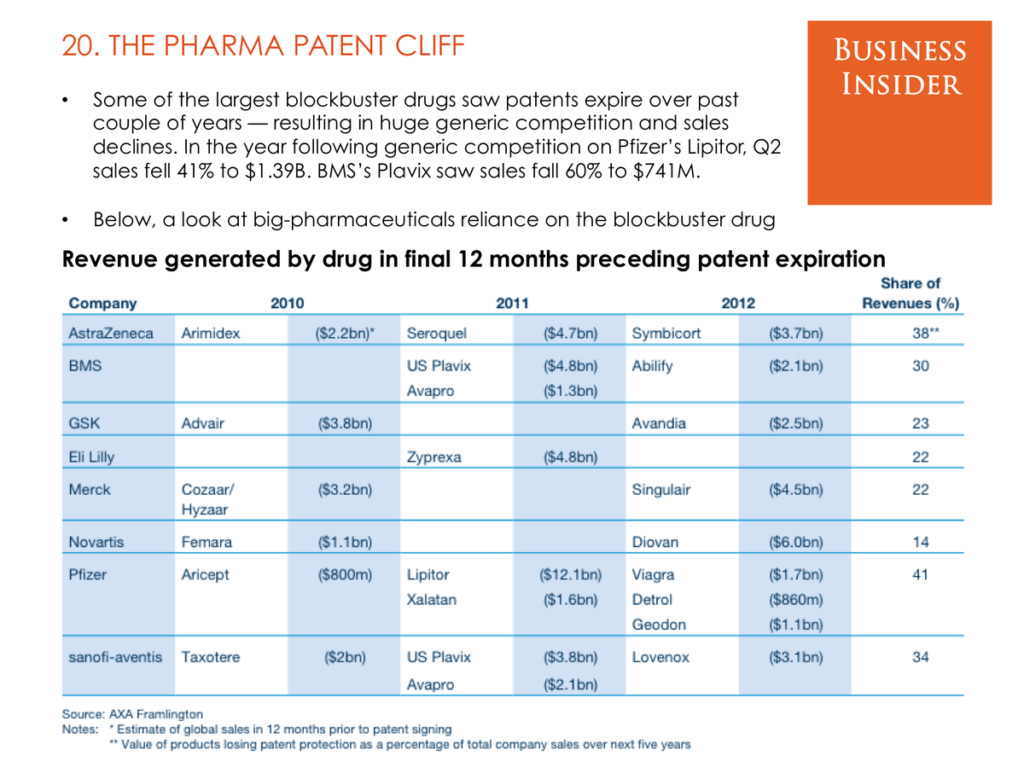 The problem begins with the looming financial threat that the top 20 Big Pharma companies face: from now until 2030, $180 billion in sales will be at risk. This threat, called a patent cliff, is a regularly occurring problem for the pharmaceutical industry. Big Pharma has long made its money by attaining patent exclusivity of certain drugs, thereby monopolizing all potential profits made off of them for a finite amount of time. When that patent exclusivity ends, the drug rolls head first off of a “patent cliff,” and tens of billions of dollars in revenue are put at risk.