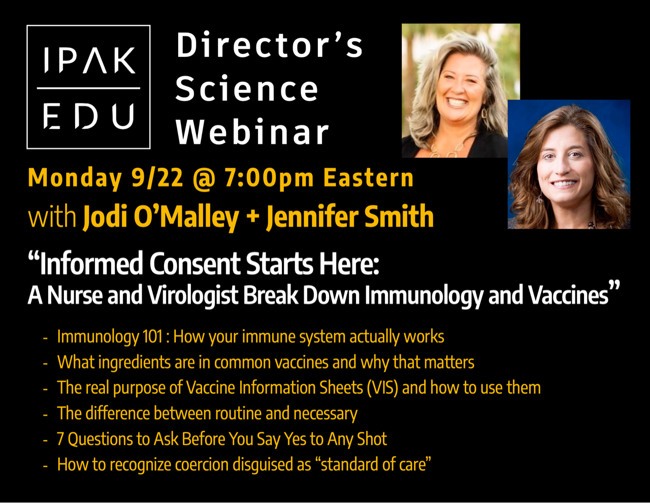 These Two Women Said What? Monday 9/22/2025 Informed Consent Starts HereIPAK-EDU Director's Science Webinar - Don't Miss It!James Lyons-Weiler, PhDSep 18, 2025294ShareSIGN ME UP!SubscribeShareLeave a commentPreviousNext