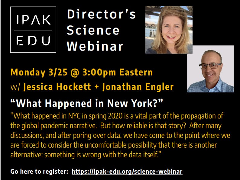 I have pointed out several problems with Hockett's theory here: sars2.net/nopandemic.html#Jessica_Hockett. For example she says that the virus may have already been everywhere before March 2020 but it was only detected once testing was turned on, so that there was no viral spread but only a spread of testing. However in early March all counties of NYC have days with zero positive PCR tests. For example in Bronx there's a total of 29 tests listed between March 1st and March 7th but zero of them are positive, and on March 10th there's 47 tests listed but zero of them are positive.