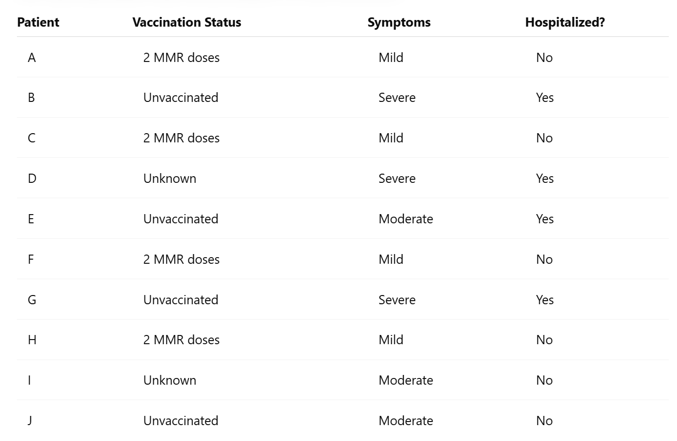 This distribution reinforces the pattern: all hospitalizations occurred in unvaccinated or unknown-status individuals, while all vaccinated cases had milder courses. However, this justification would seem to imply that the MMR does not prevent measles cases, and if it does prevent measles cases, it is a fair question: Does the MMR vaccine no longer prevent transmission?