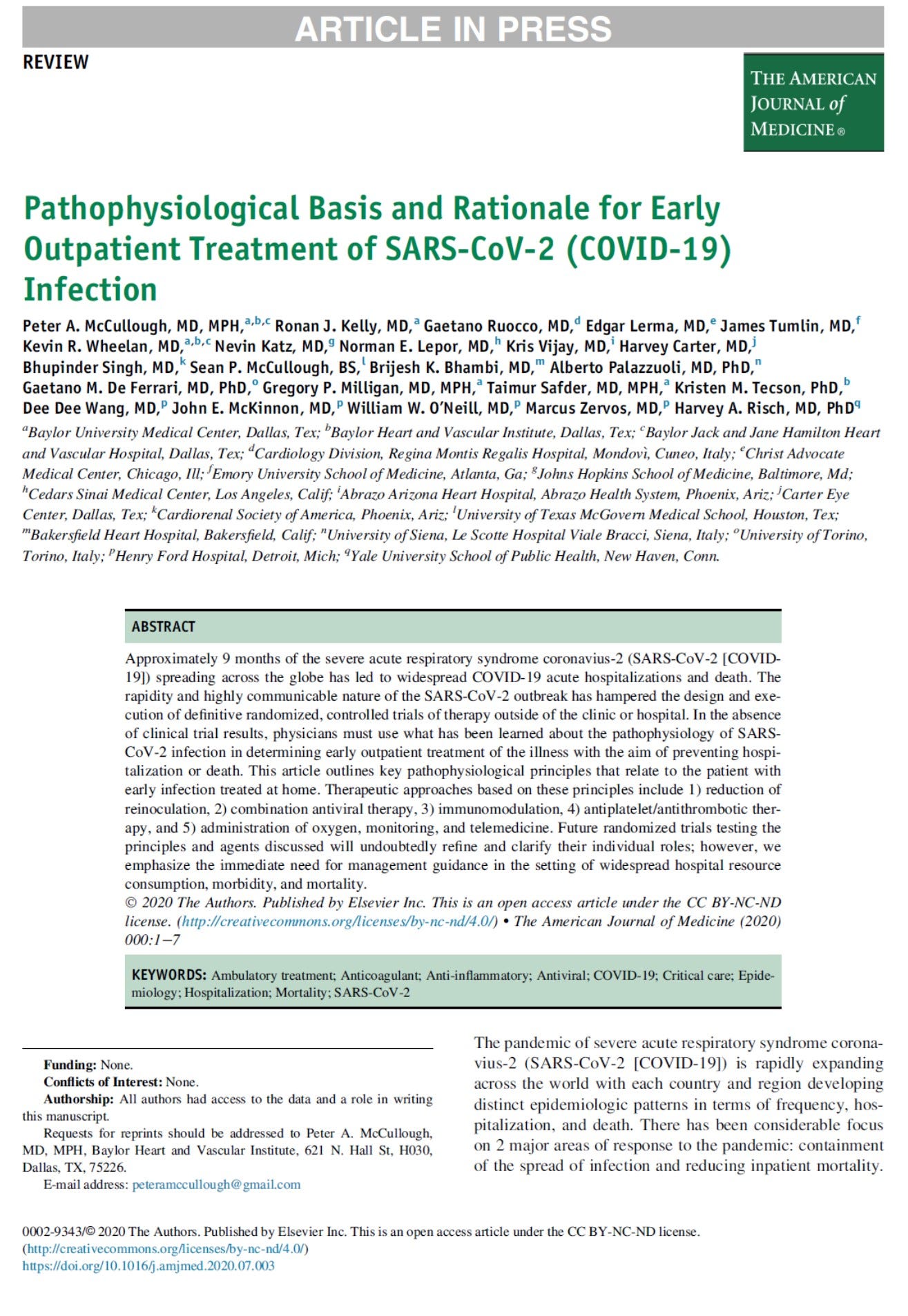 McCullough et al., 2021. Pathophysiological Basis and Rationale for Early Outpatient Treatment of SARS-CoV-2 (COVID-19) Infection. Am J Med https://www.amjmed.com/article/S0002-9343(20)30673-2/fulltext