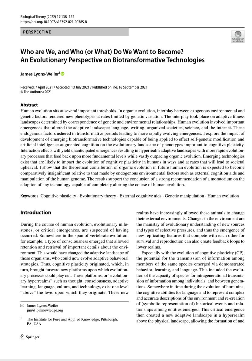 Lyons-Weiler, J. Who are We, and Who (or What) Do We Want to Become? An Evolutionary Perspective on Biotransformative Technologies. Biol Theory 17, 138–152 (2022). https://doi.org/10.1007/s13752-021-00385-8.